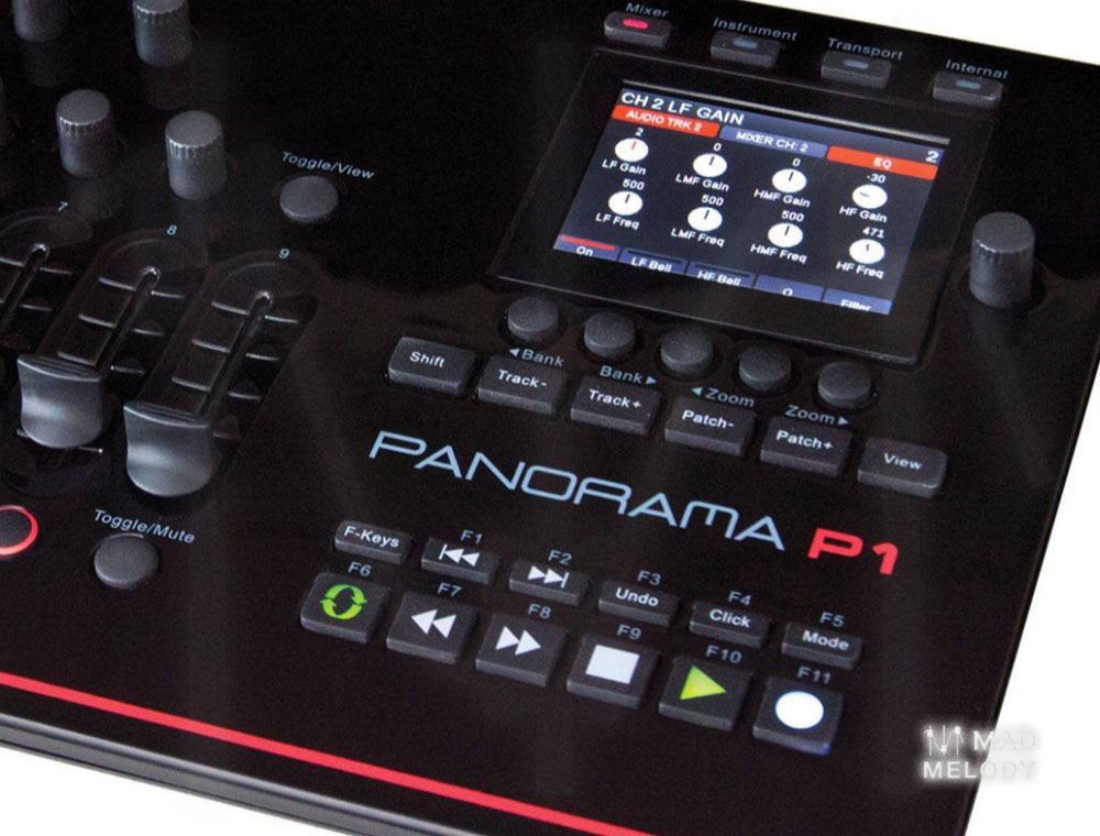 It’s hard to go places without transport so Panorama features an extended 11 button transport bar, positions right where you need it controlling: Return to L, Forward to R, Undo, Click on/off, Record Mode, Cycle on/off, Back, Forward, Stop, Play and Record. Using the shift button, these also double up as 11 function buttons each assignable to MIDI commands or QWERTY macro’s.