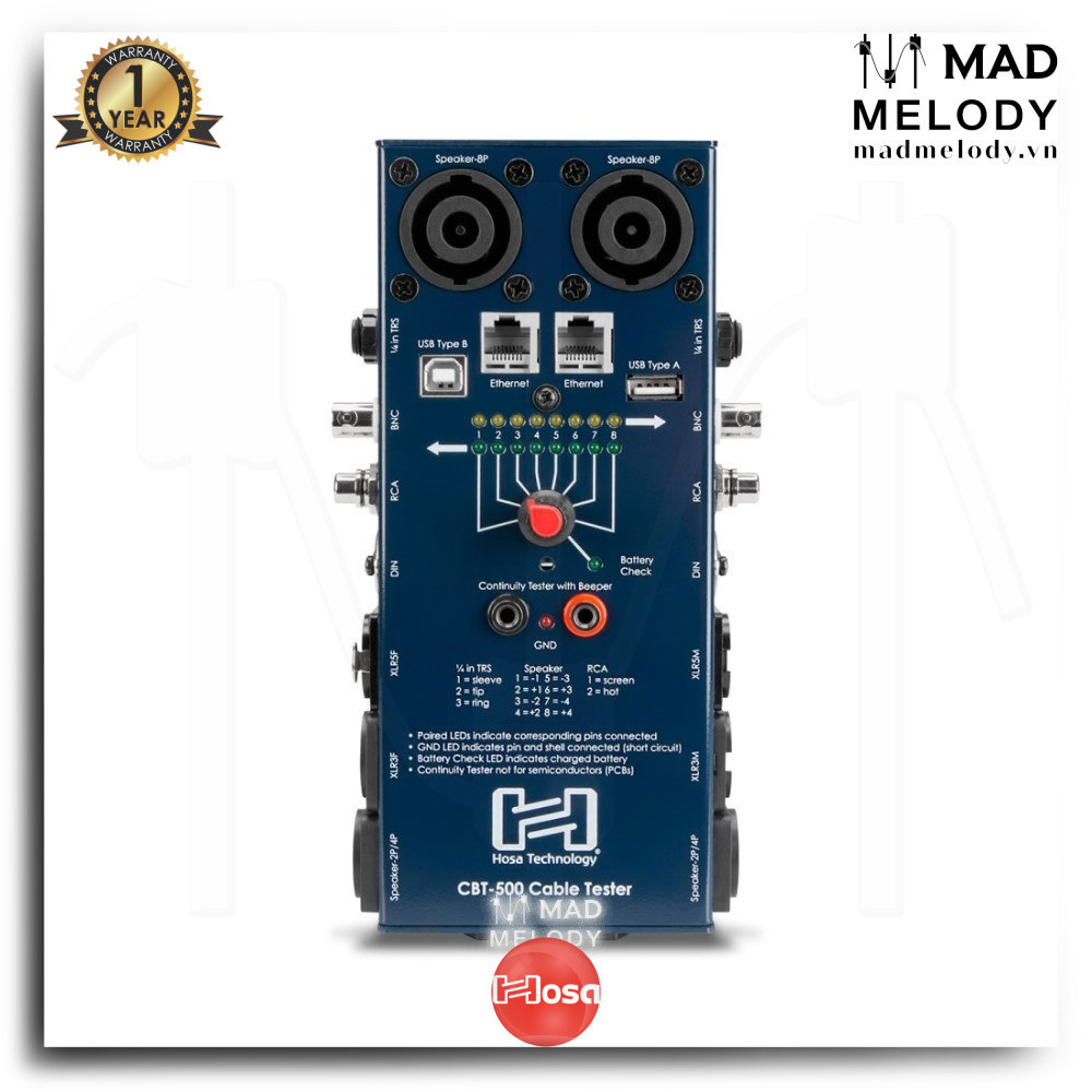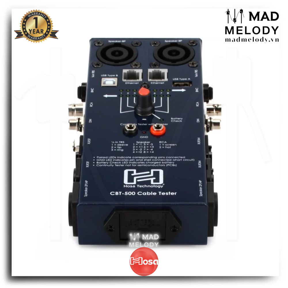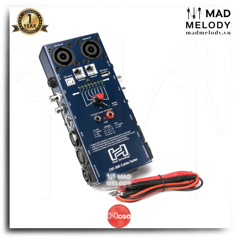 Bộ kiểm tra dây cáp Hosa CBT-500 Cable Tester kiểm tra và xác định hỏng hóc đường tín hiệu của các loại dây cáp với đầu nối như XLR, 6ly TS TRS, bông sen (RCA), speakON®, DIN (MIDI), Ethernet, 75-ohm BNC, và USB Type A qua Type B. Mặt trên của bộ Hosa CBT-500 này còn trang bị hai cổng kết nối hai đầu kim kiểm tra nối mạch (máy kêu "bíp" khi điện trở hai đầu dây bằng 0) để kiểm tra dây dẫn hoặc các đầu jack cắm. Máy hoạt động nhờ pin 9V có thể tháo rời (đã kèm theo).