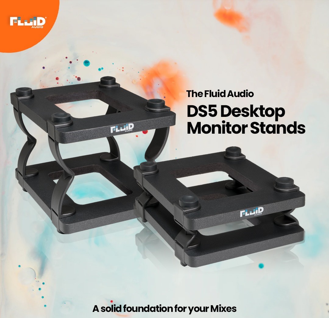 The Fluid Audio DS5 desktop monitor stand is designed for use with 4” and 6” driver loaded studio monitors. They elevate your monitors to one of two heights: 2.5” and 5”. Using custom formulated rubberized silicone feet, the stands provide critical acoustic isolation. Tilt can also be set to one of 3 angles: Flat, 3, and/or 6 degrees of tilt.