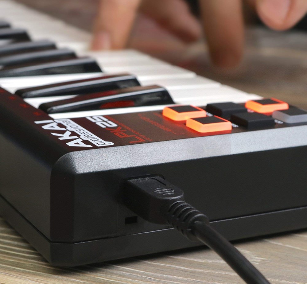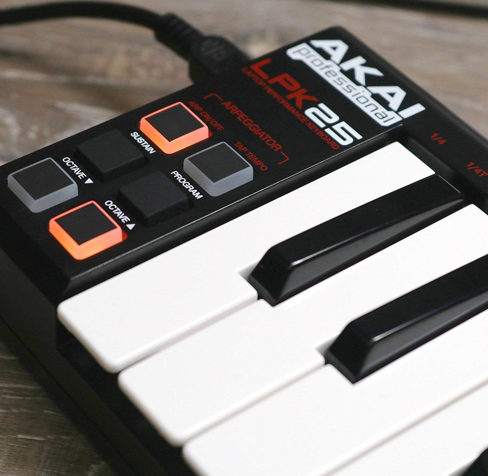 If you like to take your ideas with you and refuse to be tied down to a desk, you just can't beat the Akai Professional LPK25 ultra-portable keyboard controller. Its small format lets it travel comfortably in the outer pocket of your laptop case, and you won't even notice its light weight design when you're on the move. You don't even have to lug around an AC adapter because the LPK25 runs completely off of USB buss power. Twenty five low-profile keys with real synth action give you plenty of immediate note access and playability, while the LPK25 remains shallow enough that you can comfortably reach your qwerty keyboard without accidentally bumping notes.