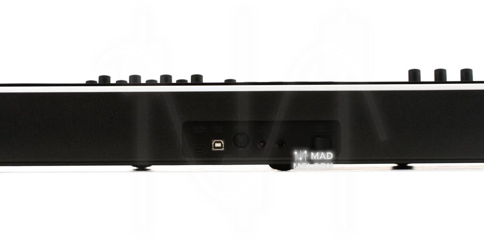 is as clean as possible and not heavy or fatiguing to play. We keep the down weight required within the heavy end of common standards for acoustic pianos. In addition, the dynamic range is much wider than what you experience on most controller keyboards allowing better control of both low and high velocity values. 5 velocity curves gives you choice just in case your playing style requires a different feel. Monophonic aftertouch, pitch bend and modulation wheels, plus foot switch and expression pedal jacks set you up for performance.