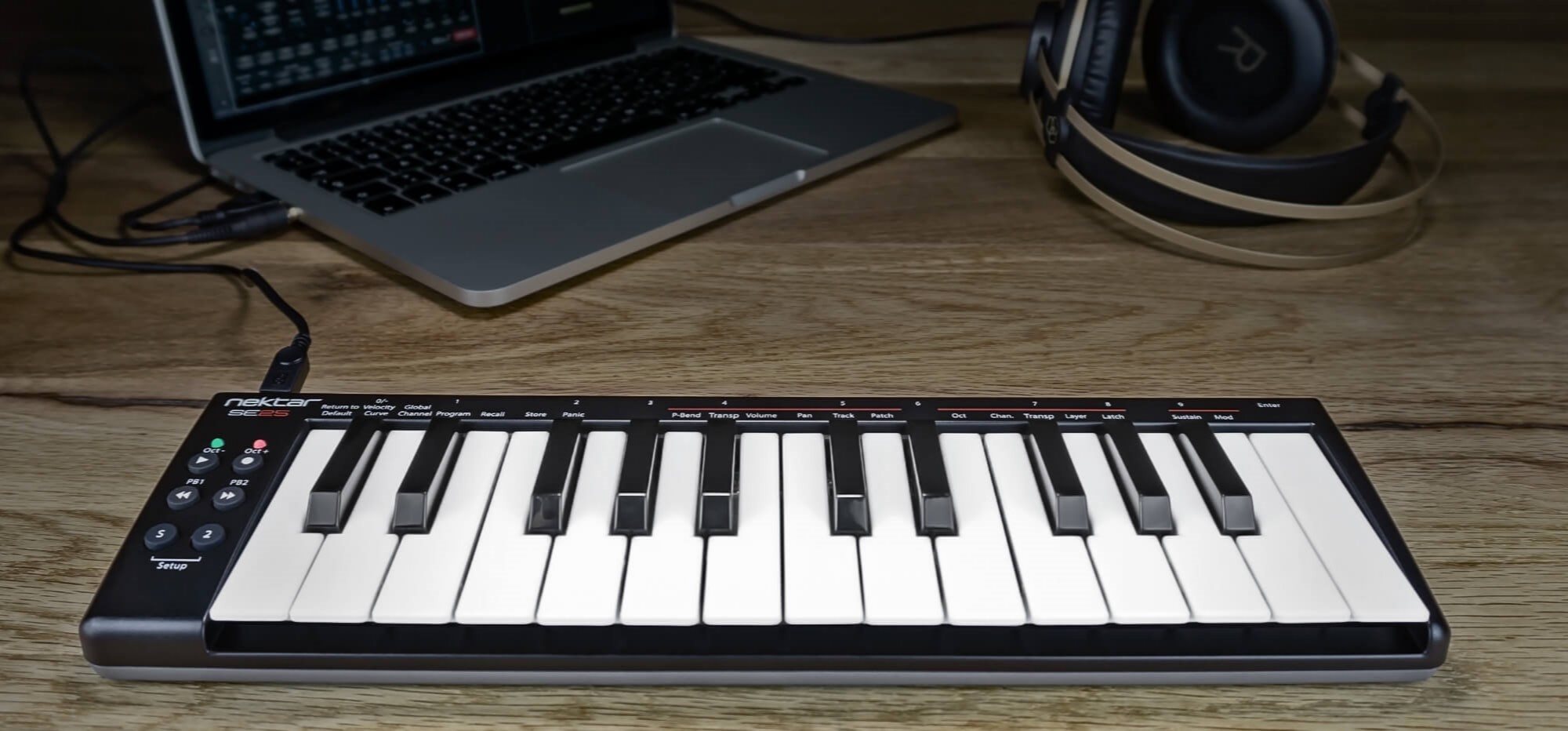 The Nektar SE25 is a great solution for any mobile production setup. Our most compact MIDI keyboard controller is about as wide as a laptop and gives you all you need to create music on the move: 25 mini keys (that actually play well), six control buttons and Nektar DAW Integration. So the SE25 is way more powerful than it might seem at first glance. And we haven’t even mentioned our unique Part 2 feature yet…