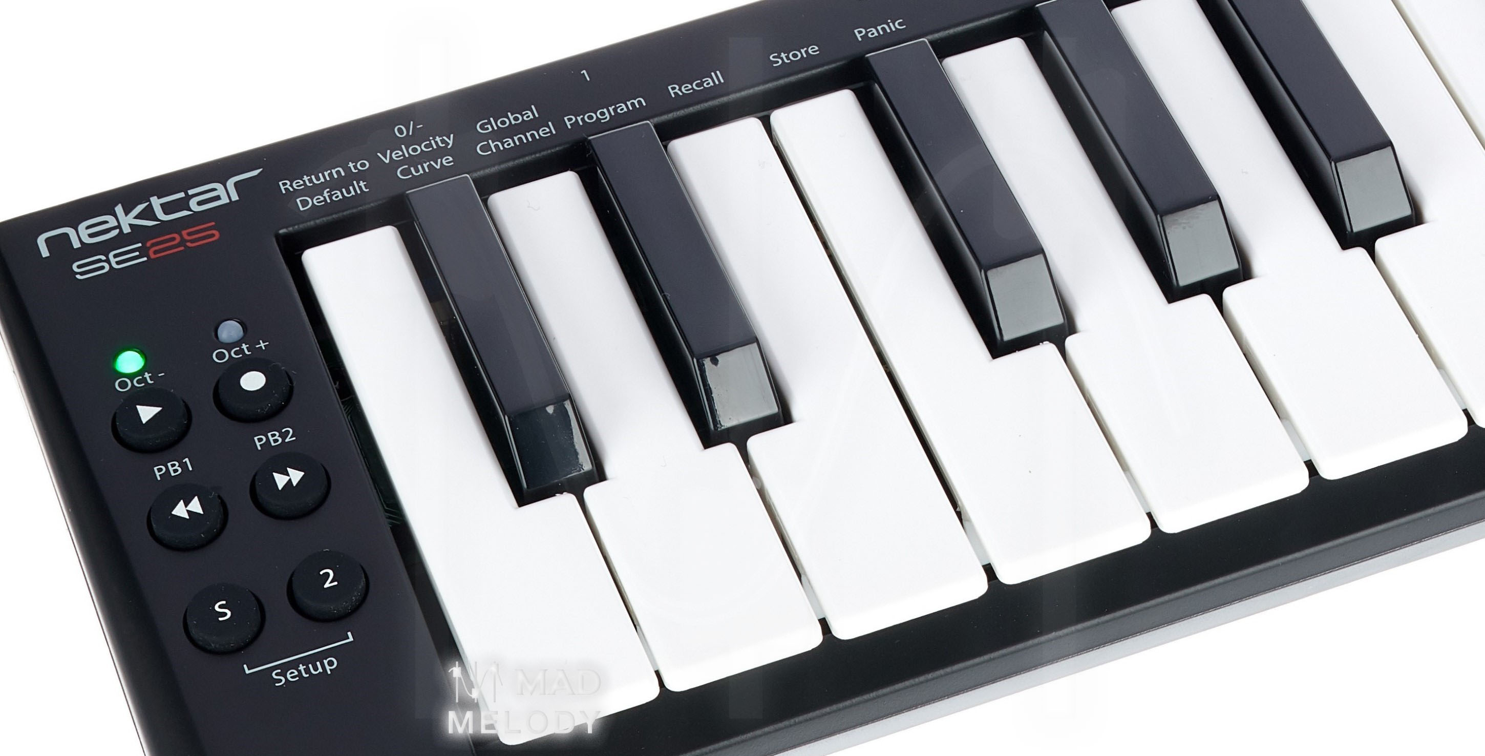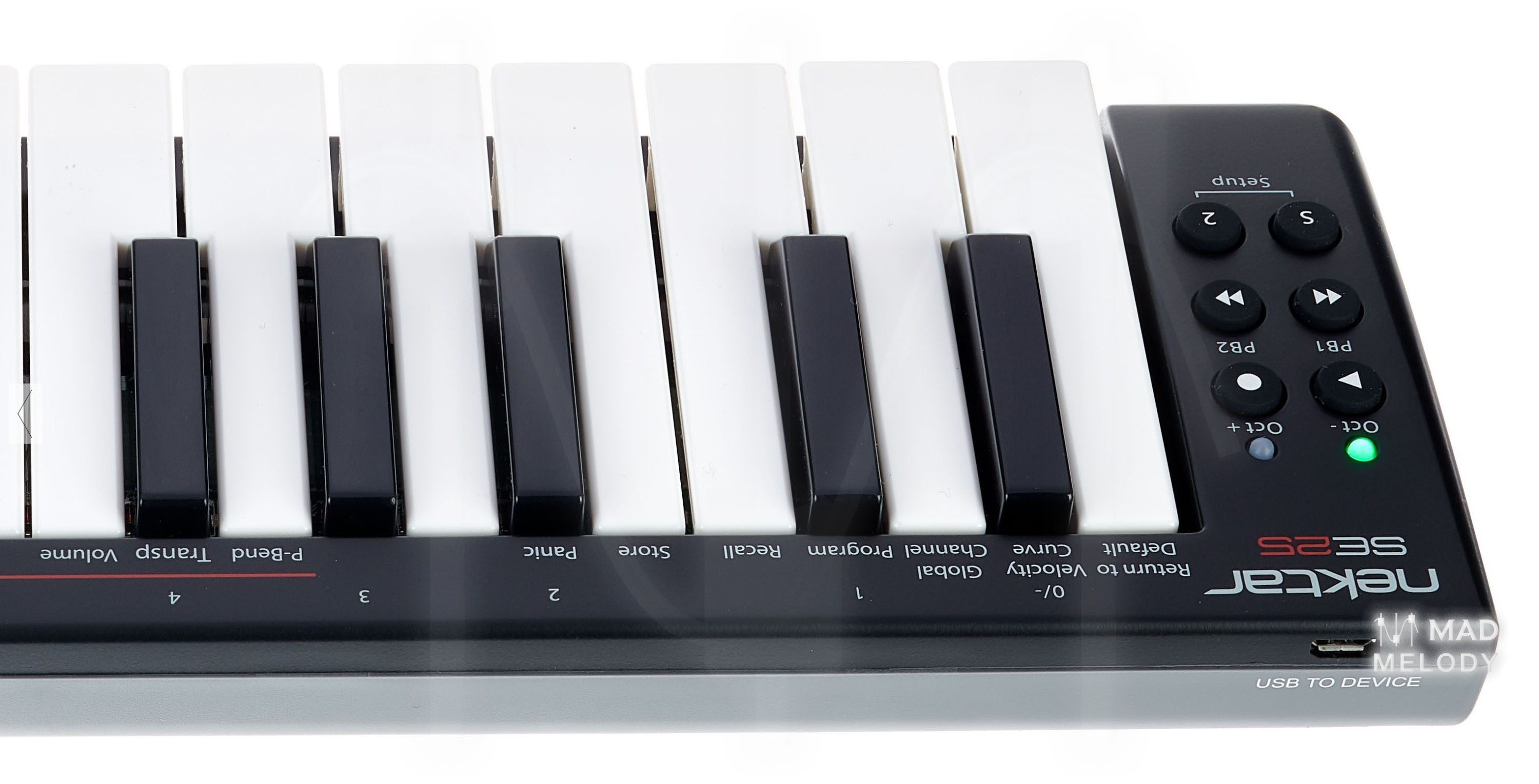 Simply press the dedicated “2” button to momentarily shift the octave, add an octave or harmony layer while you play – or switch to a different channel: The unique Part Two feature will enable you to play in ways not even possible on keyboards with many more keys! What’s so special about this? Well, the moment you let go of the Part Two button, the SE25 reverts back to its original settings. So you can toggle back-and-forth between two different keyboard configurations in realtime. A fun performance feature!