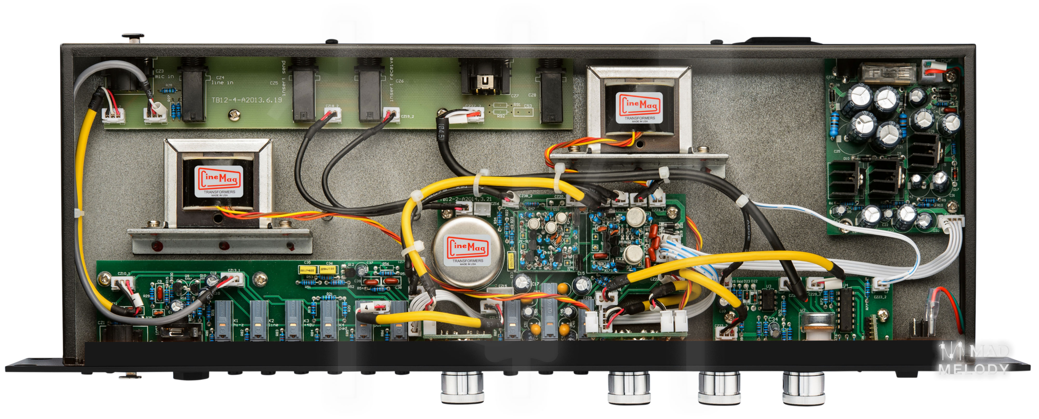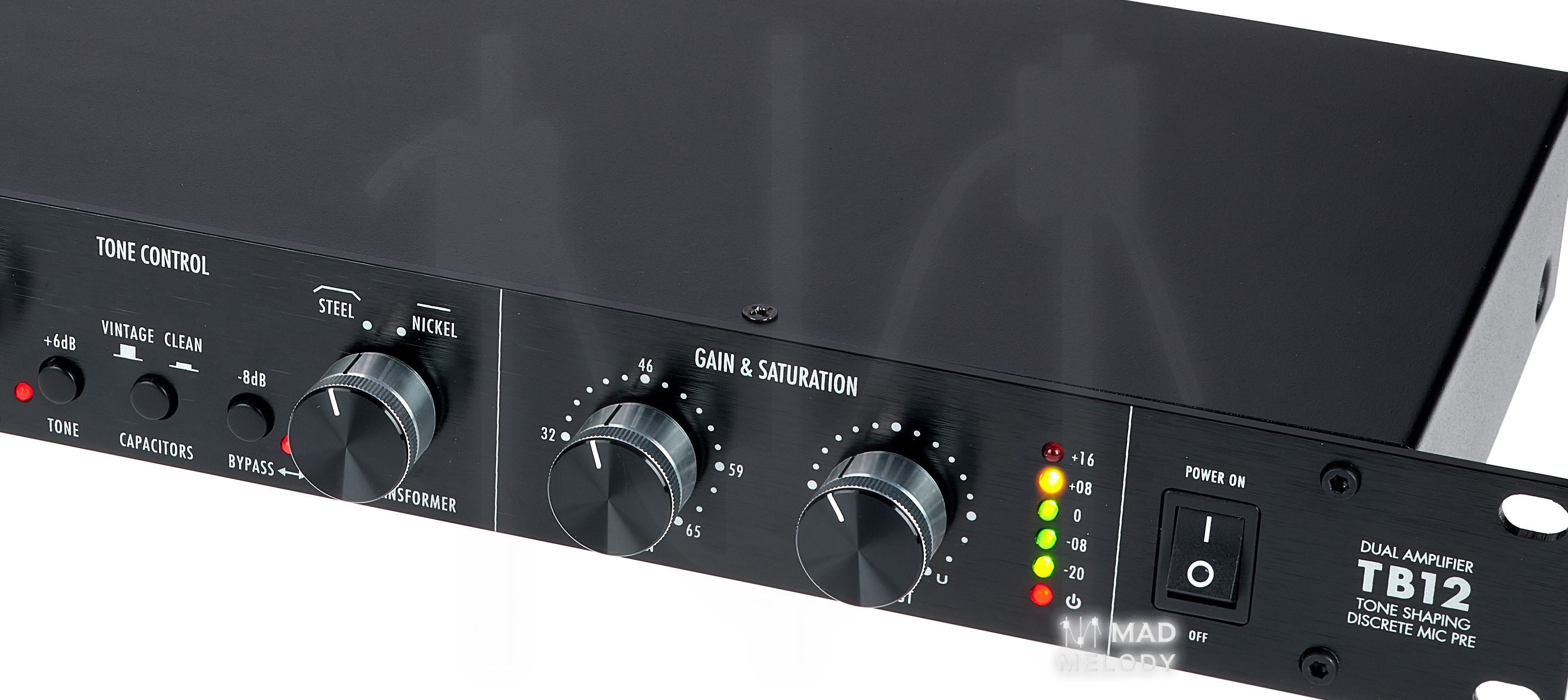 The TB12 "Tone Beast Black" is a fully discrete, high-voltage microphone preamplifier, utilzing CineMag USA Transformers. Have no fear of hurting the Beast, you can push it very hard into full-on distortion if you wish, and these can sound quite nice on electric guitar, bass or anything else that likes some grit.